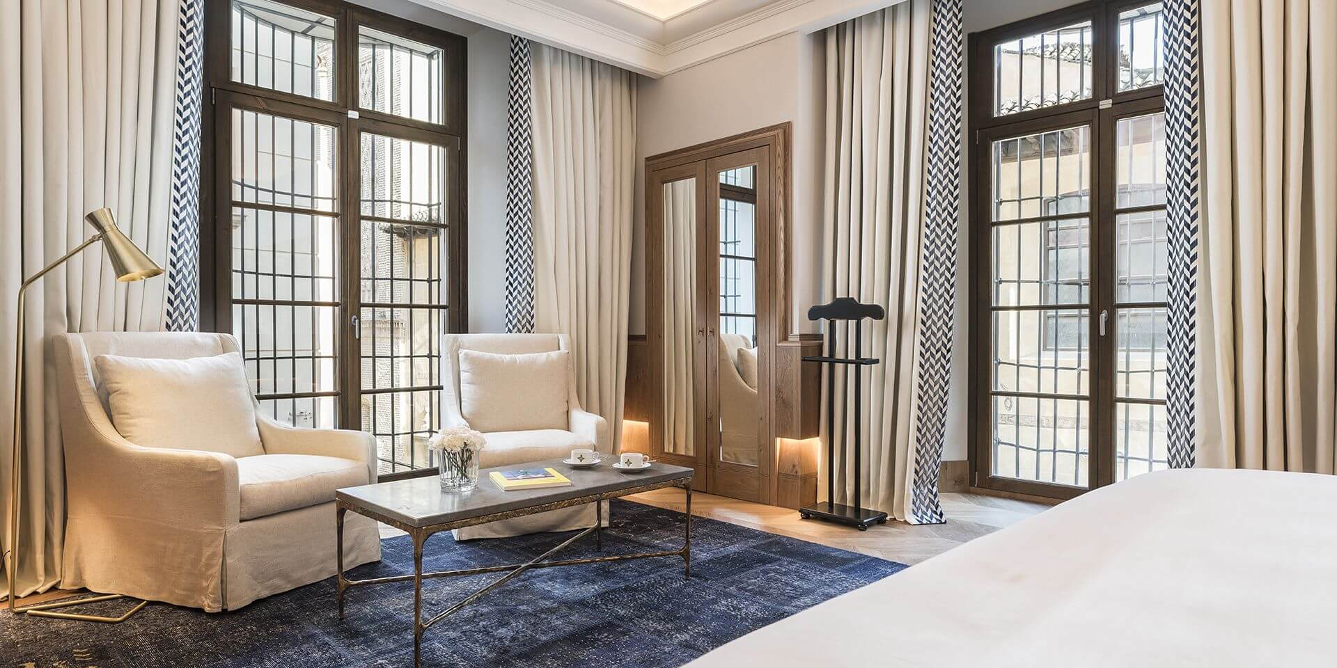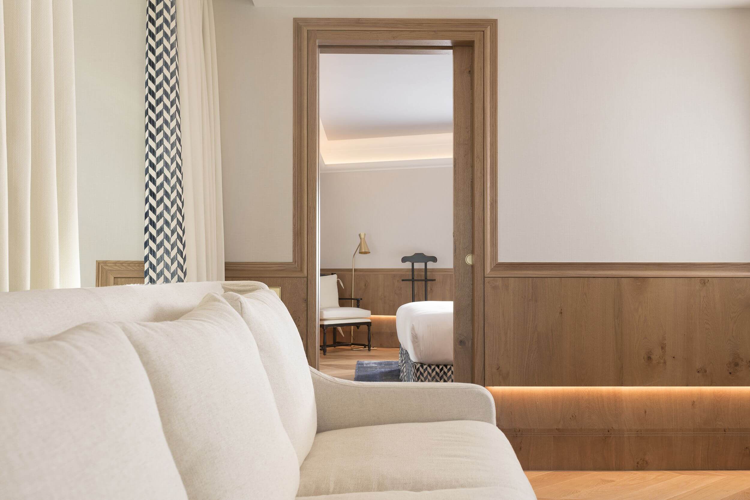 The textures and fabrics add to the high quality visible in every detail of the room. The space includes a double bed, a living room and a spacious bathroom with separate bathtub and shower.